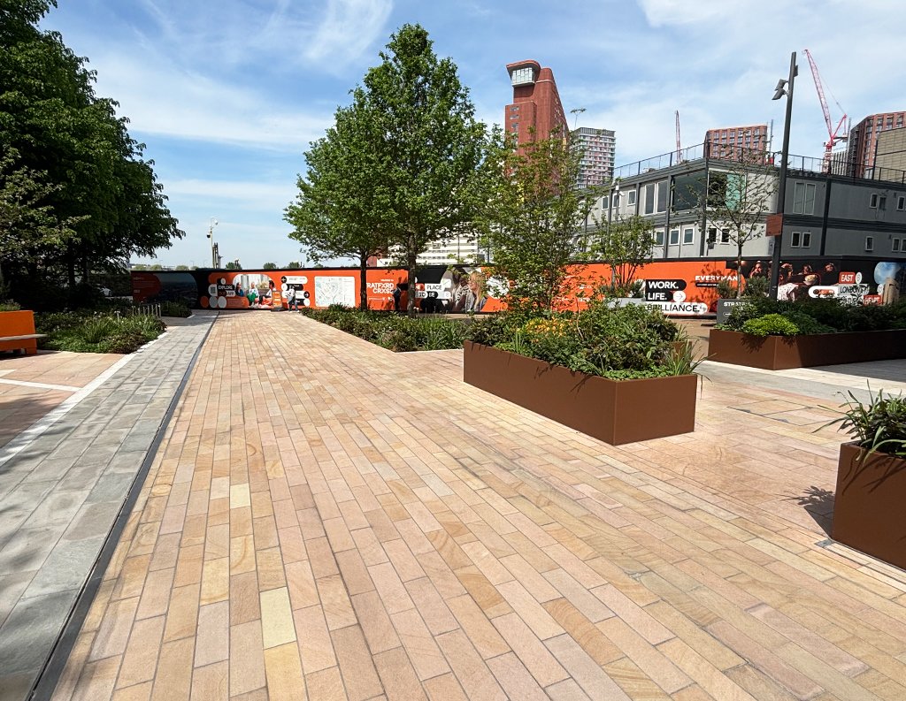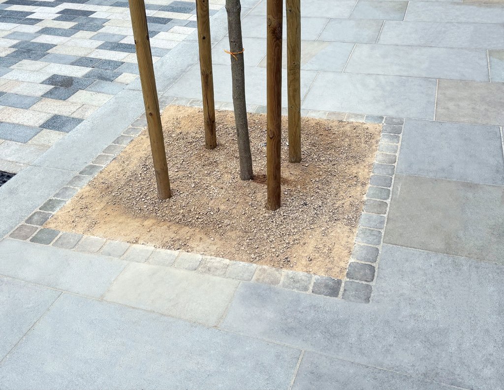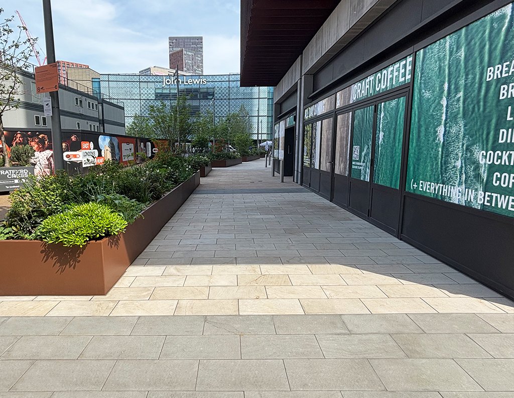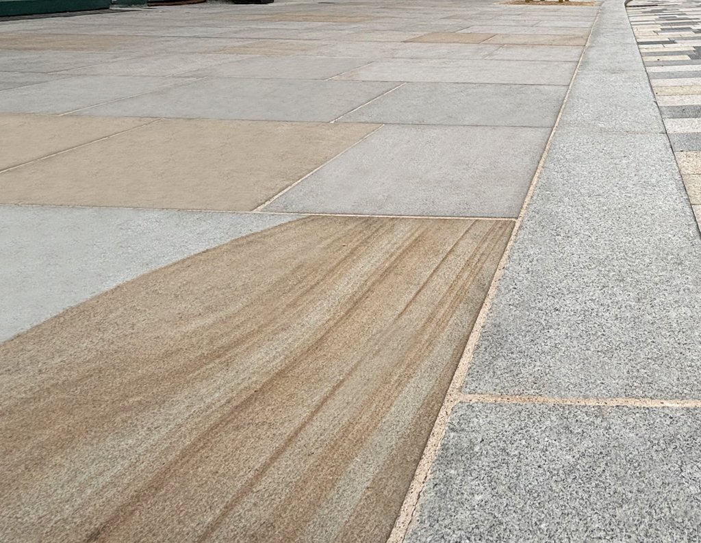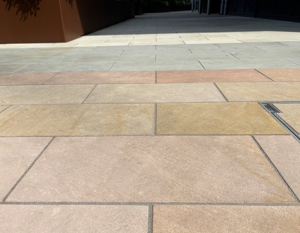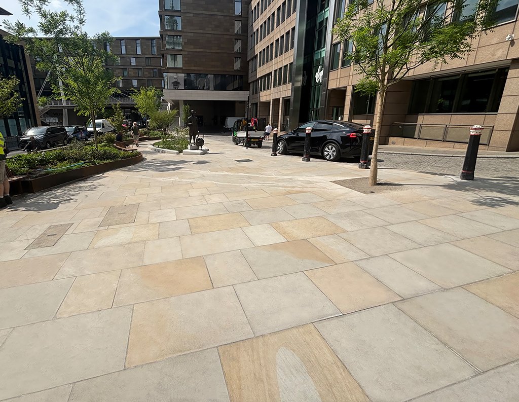 This space is brought to life through a thoughtful mix of Golden Glow and Arctic Mist paving. The contrast of colours and natural patterns adds energy and visual interest, giving the area a sense of movement and personality. Designed to withstand heavy foot traffic, the durable finishes ensure lasting performance while helping define the character of this prominent urban destination.