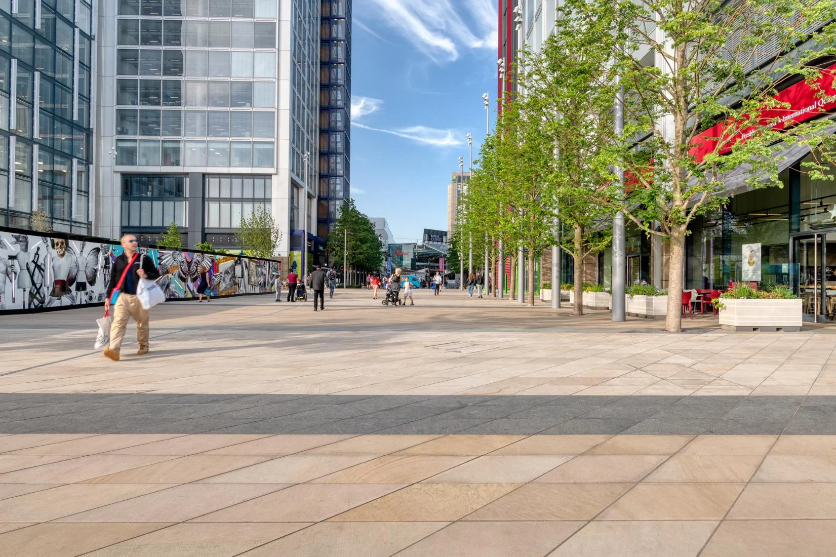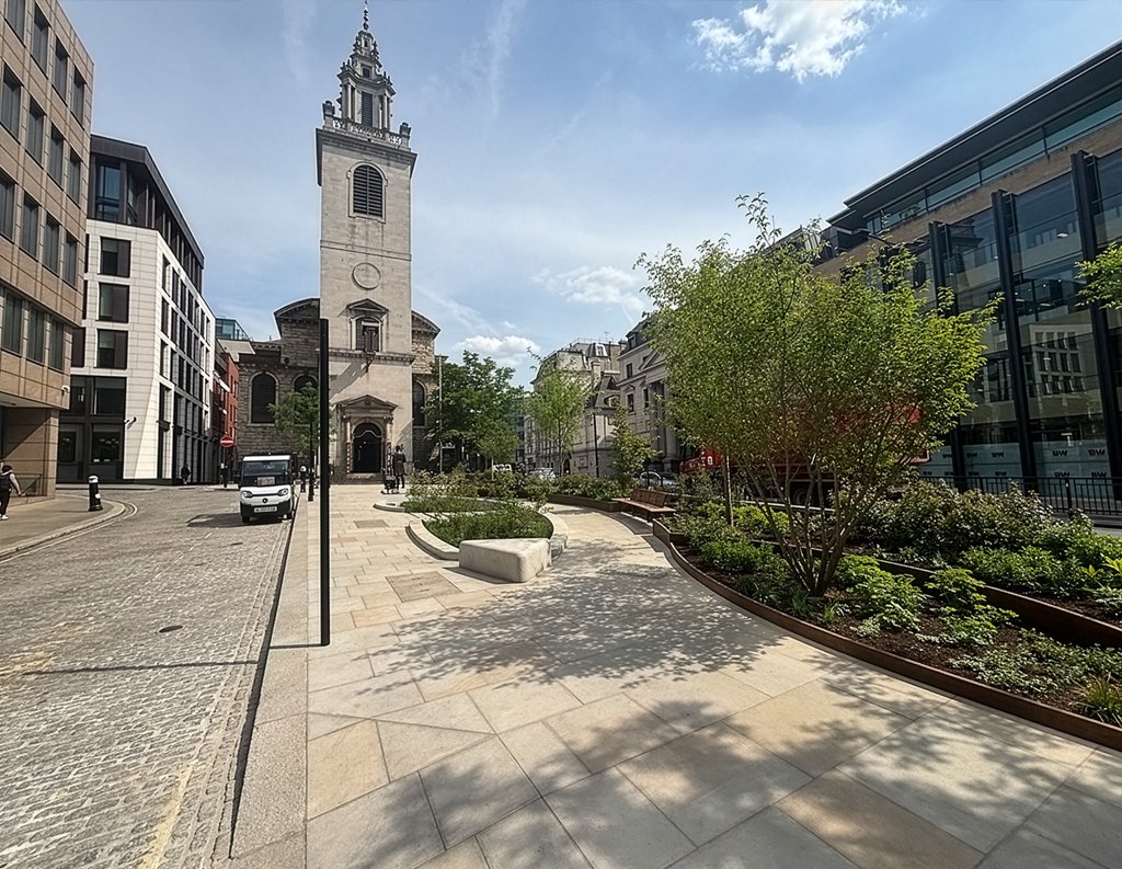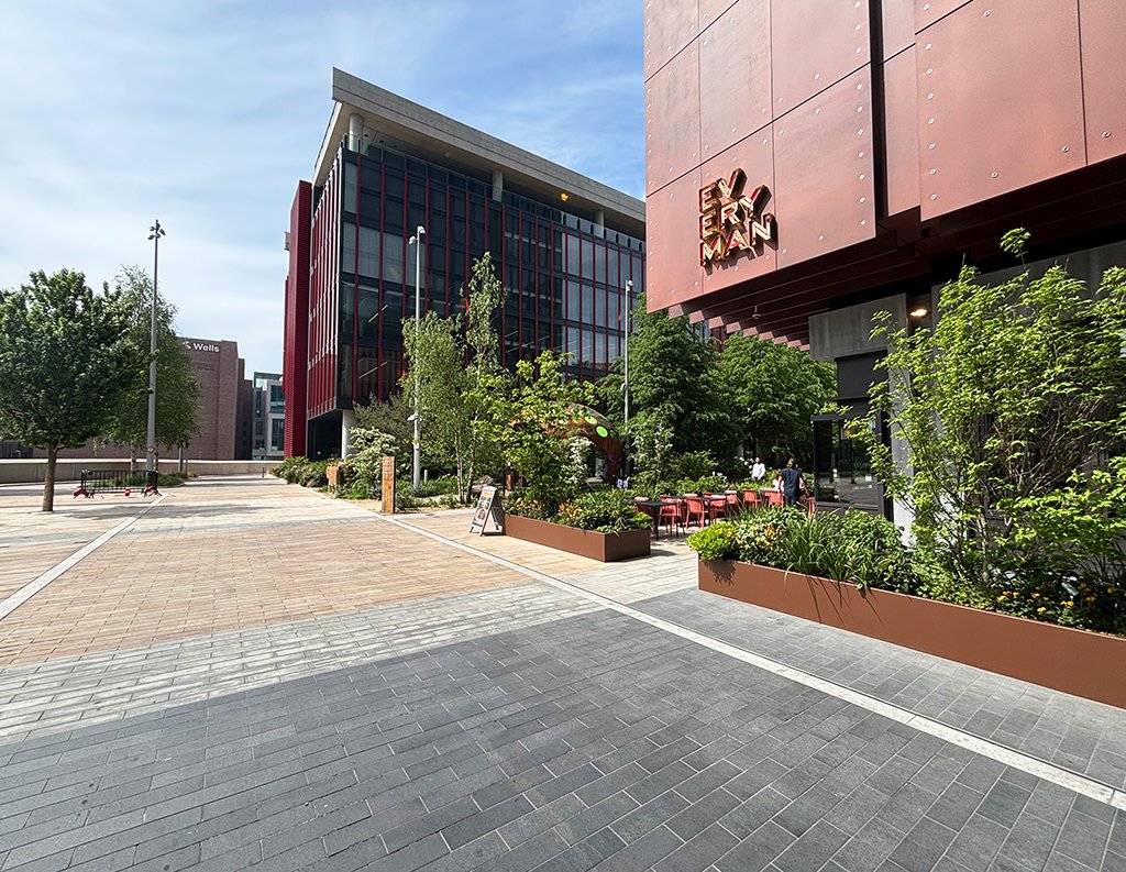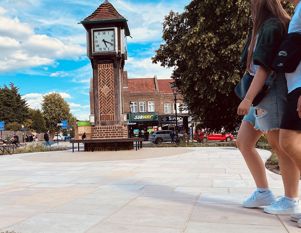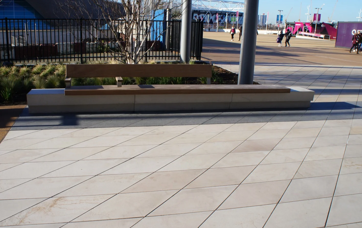 This space is brought to life through a thoughtful mix of Golden Glow and Arctic Mist paving. The contrast of colours and natural patterns adds energy and visual interest, giving the area a sense of movement and personality. Designed to withstand heavy foot traffic, the durable finishes ensure lasting performance while helping define the character of this prominent urban destination.