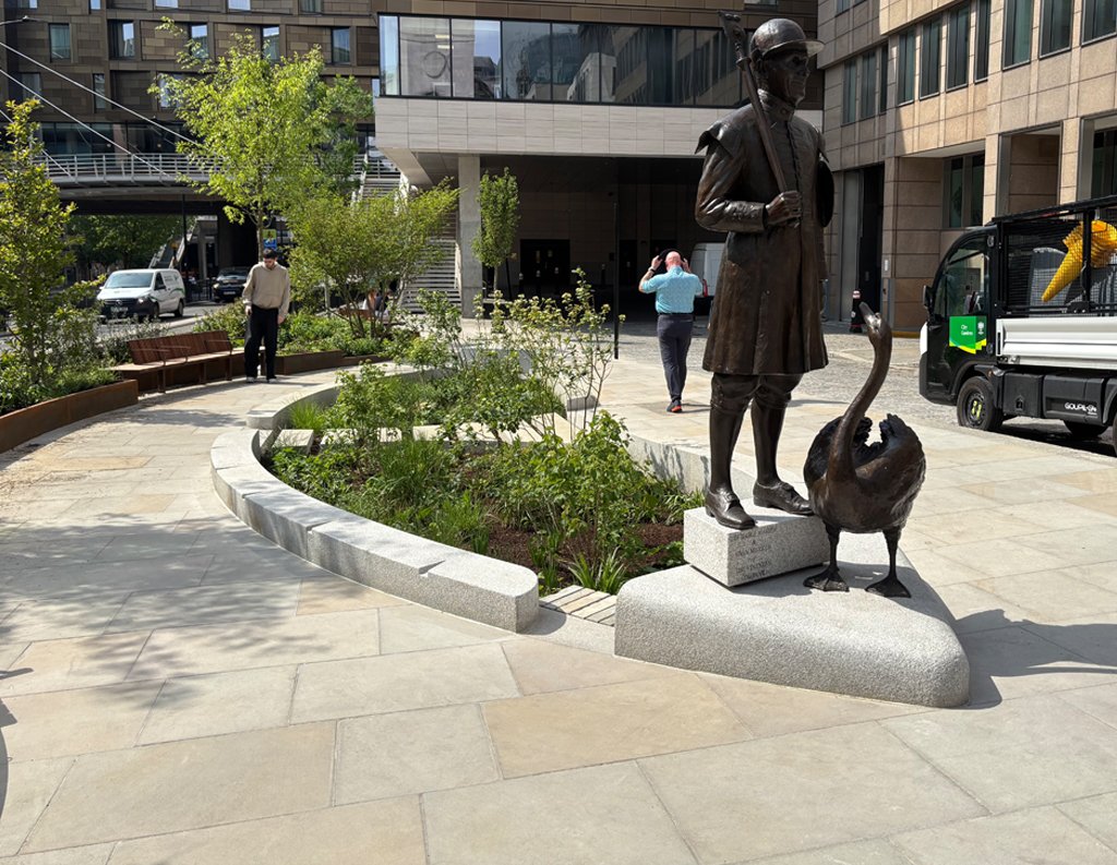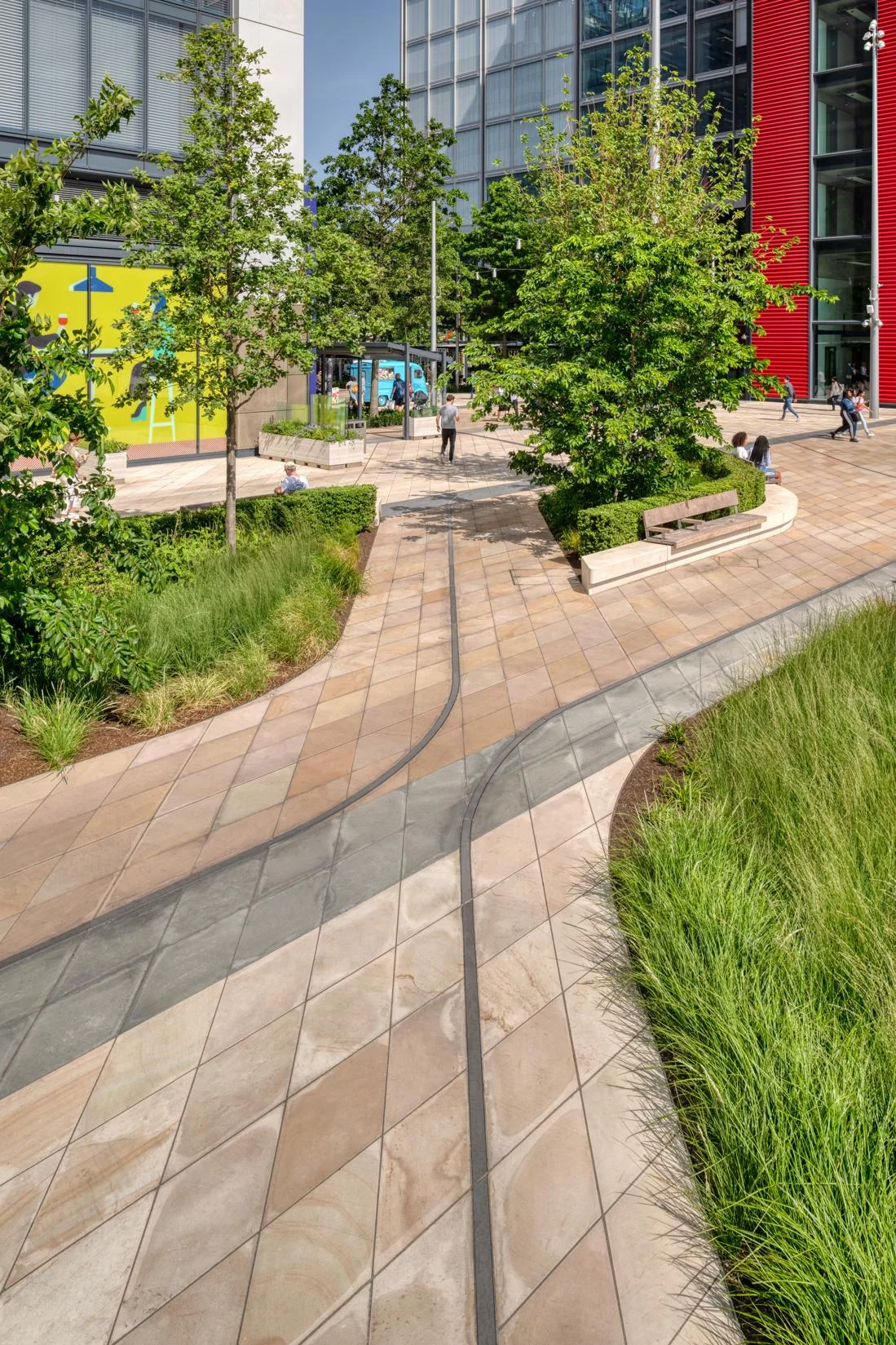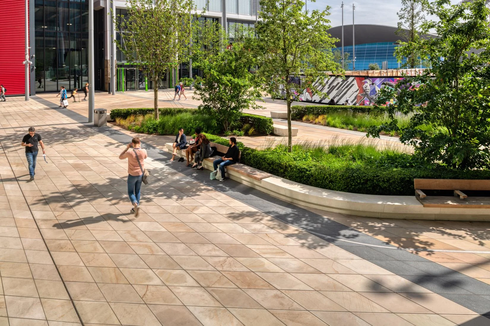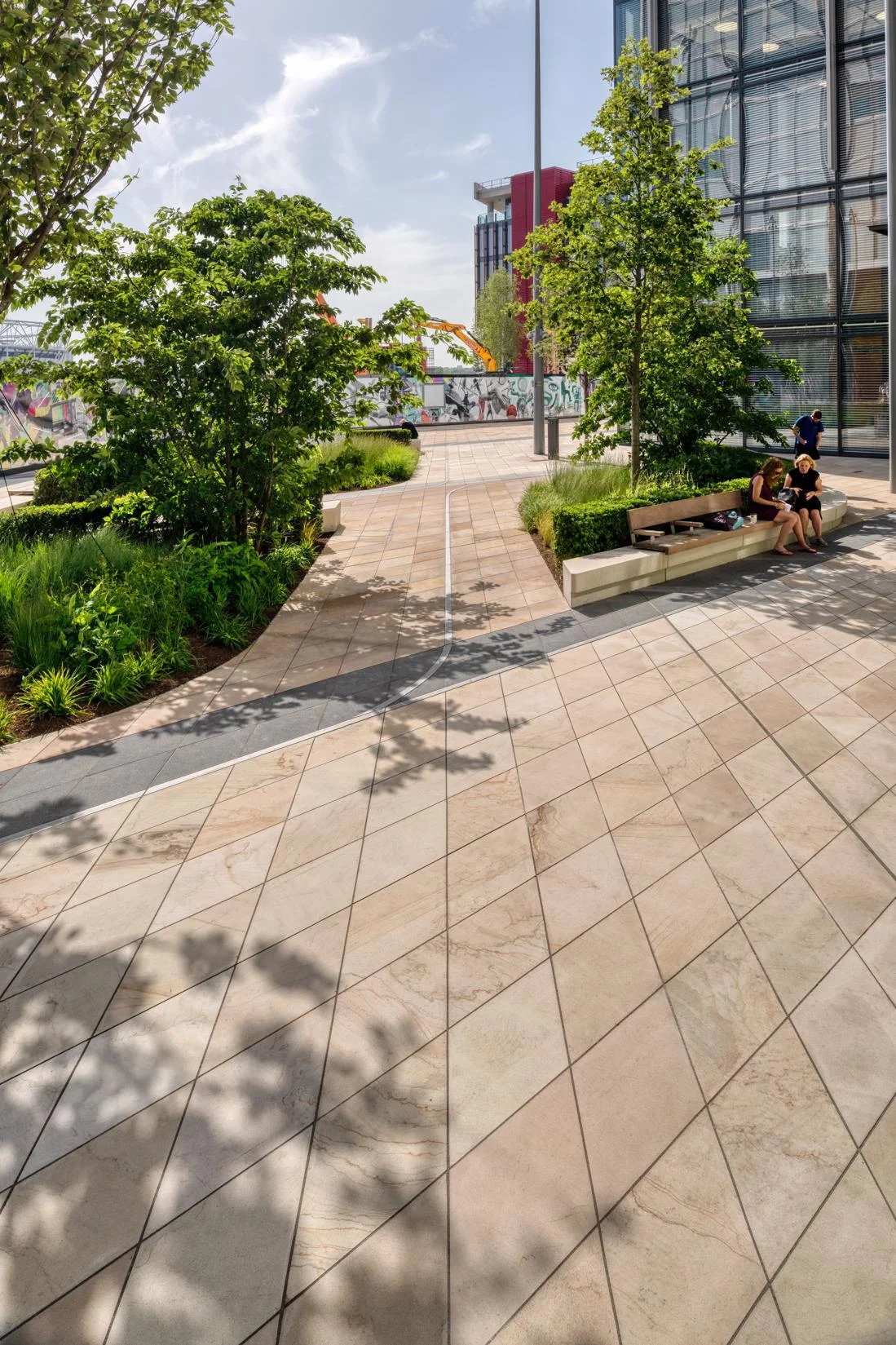 This space is brought to life through a thoughtful mix of Golden Glow and Arctic Mist paving. The contrast of colours and natural patterns adds energy and visual interest, giving the area a sense of movement and personality. Designed to withstand heavy foot traffic, the durable finishes ensure lasting performance while helping define the character of this prominent urban destination.