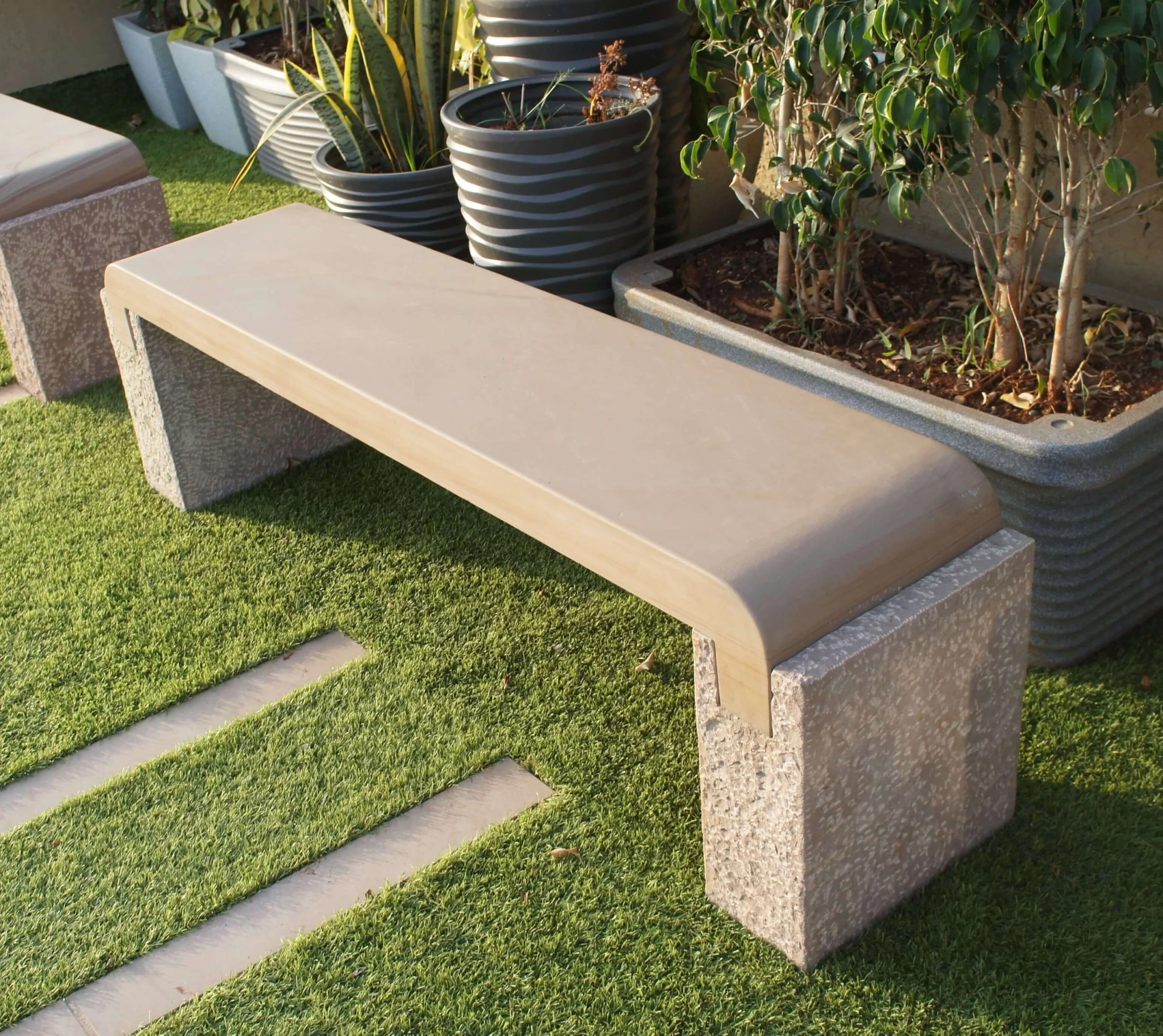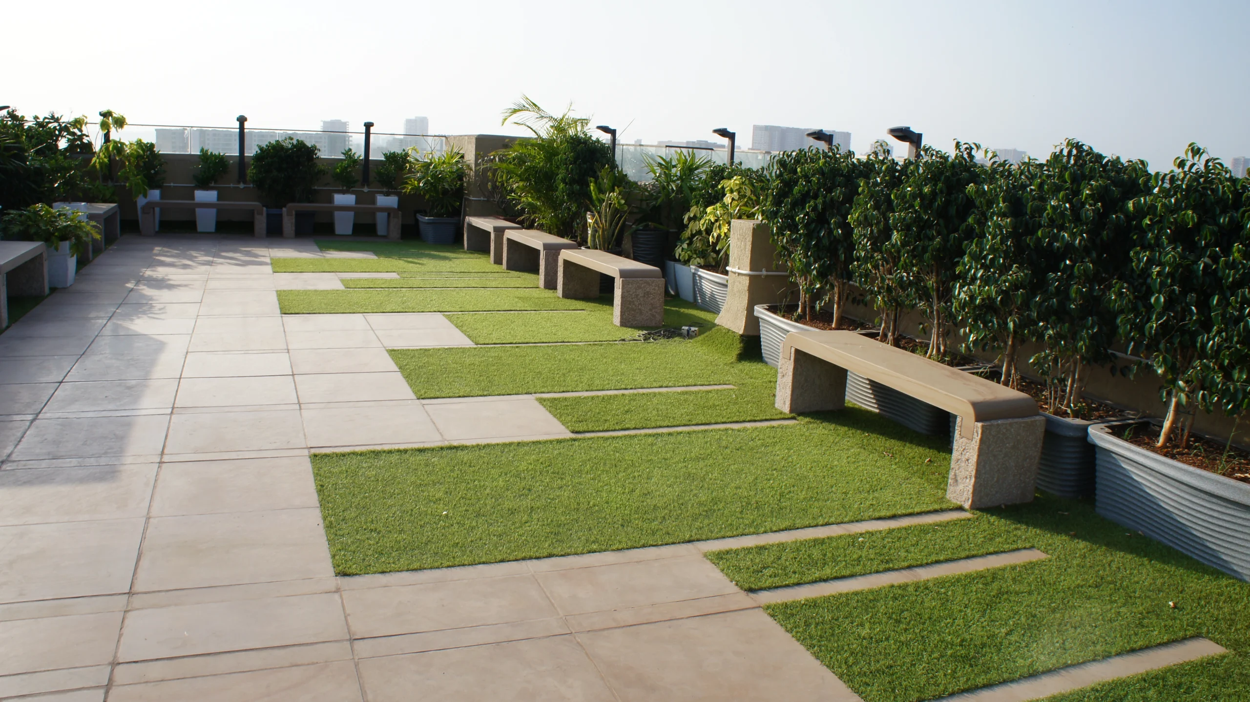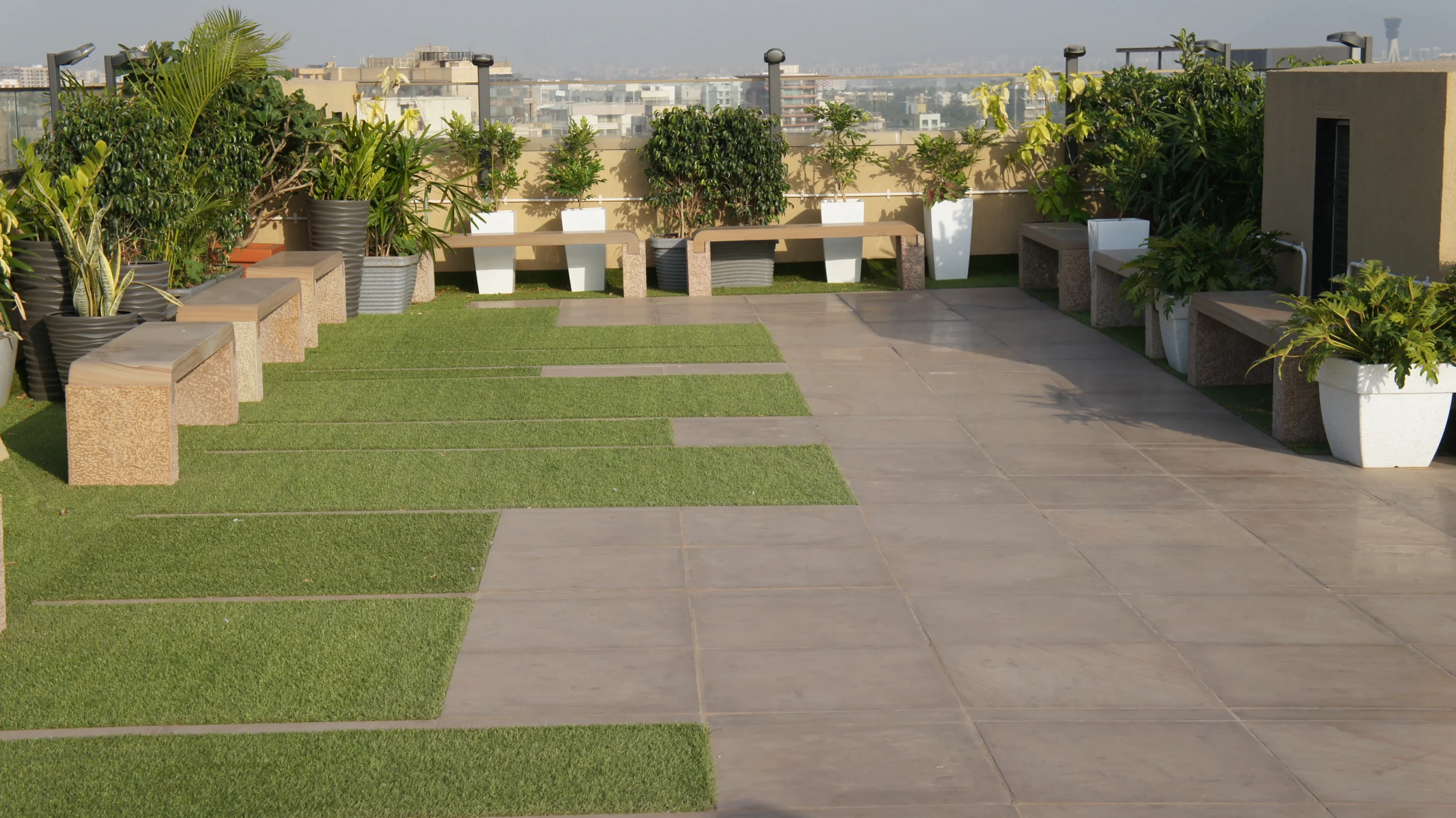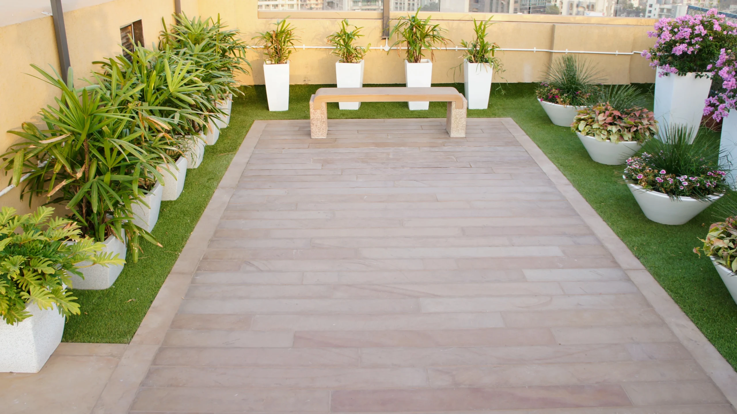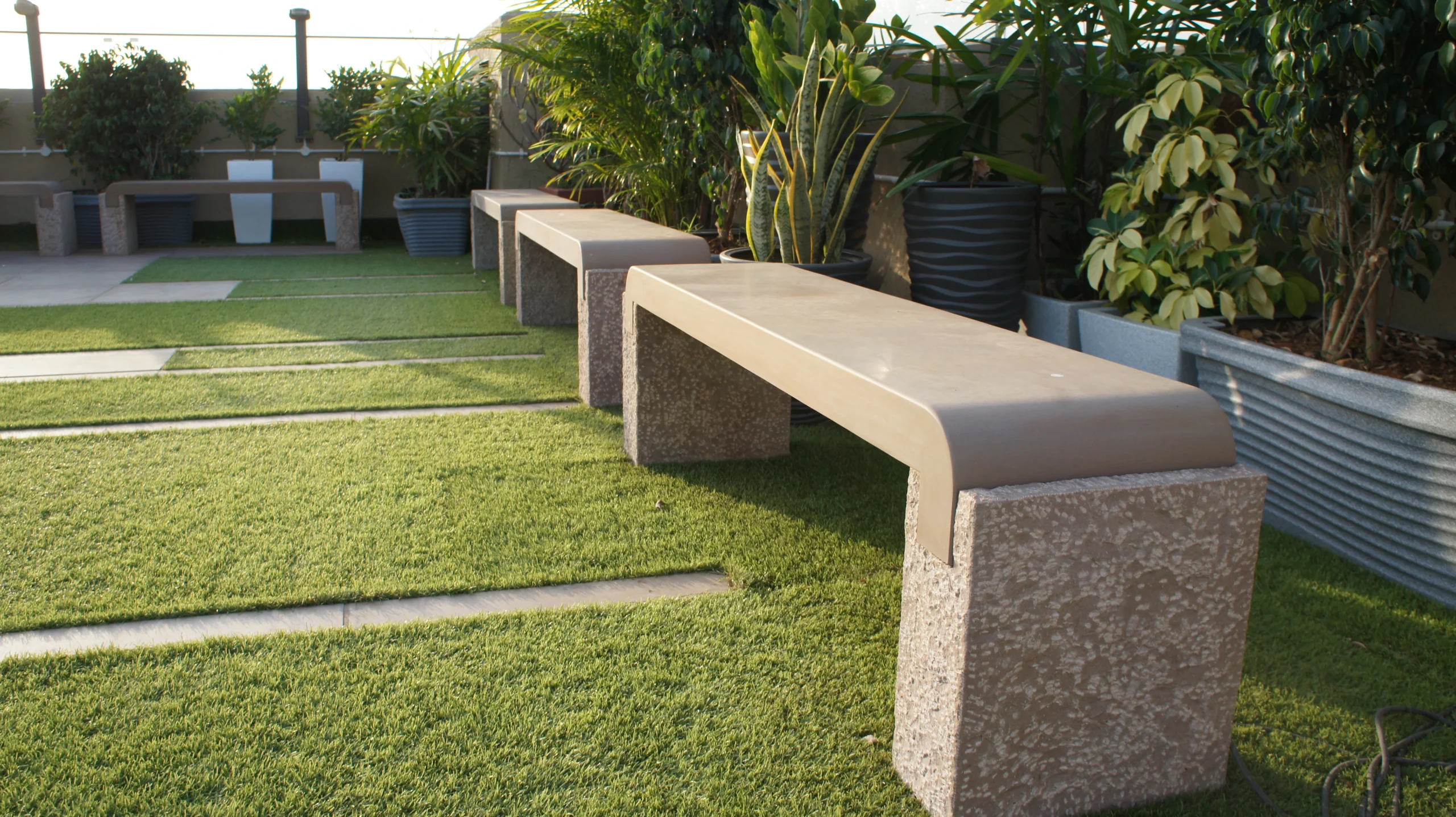 This project in Mumbai features Golden Glow and Copper Ridge in a soft satin finish, creating a warm, welcoming atmosphere. The paving flows seamlessly into the surrounding greenery, while the Harmony benches integrate into the layout with an understated presence. Every element works together in a calm, consistent way, creating an open, relaxed space that feels naturally balanced.