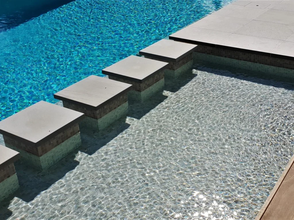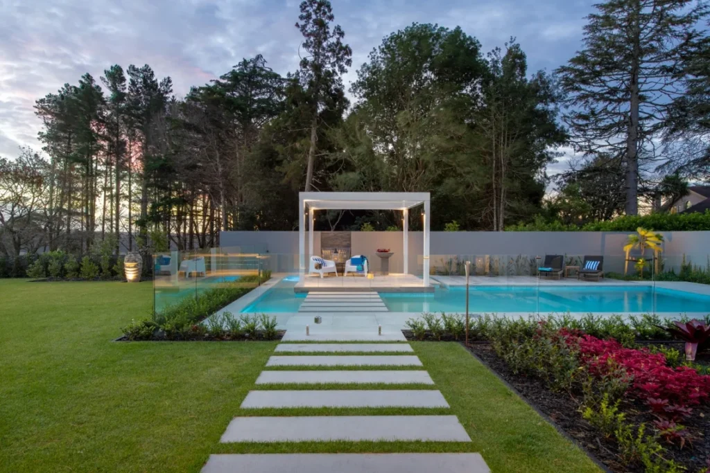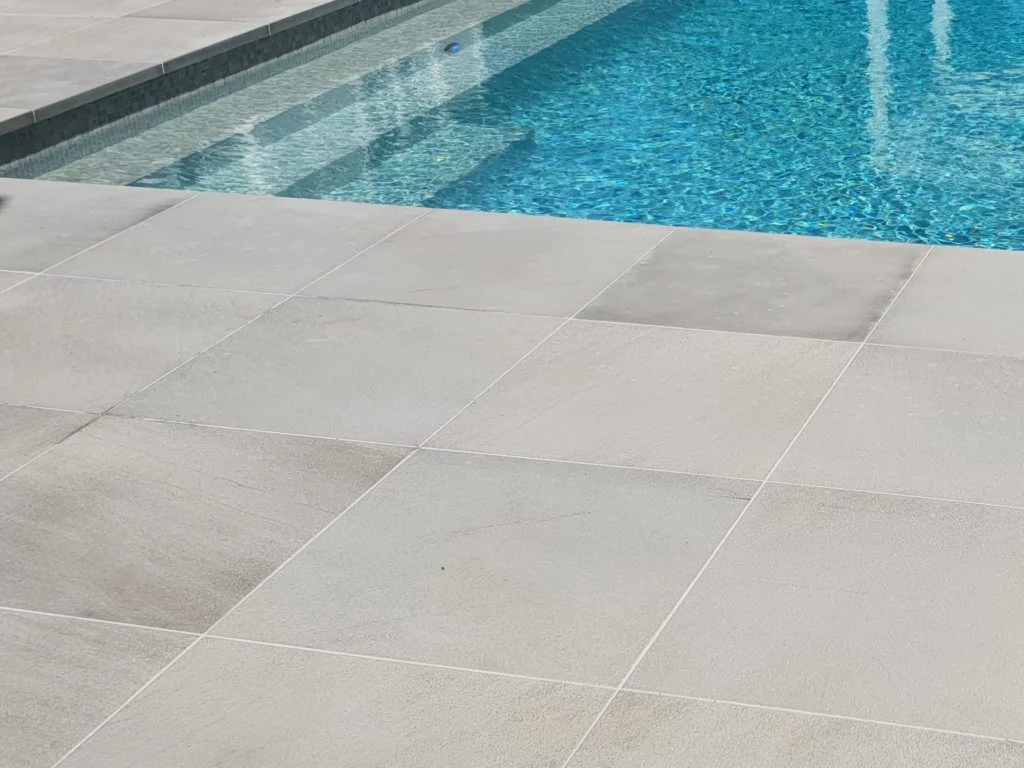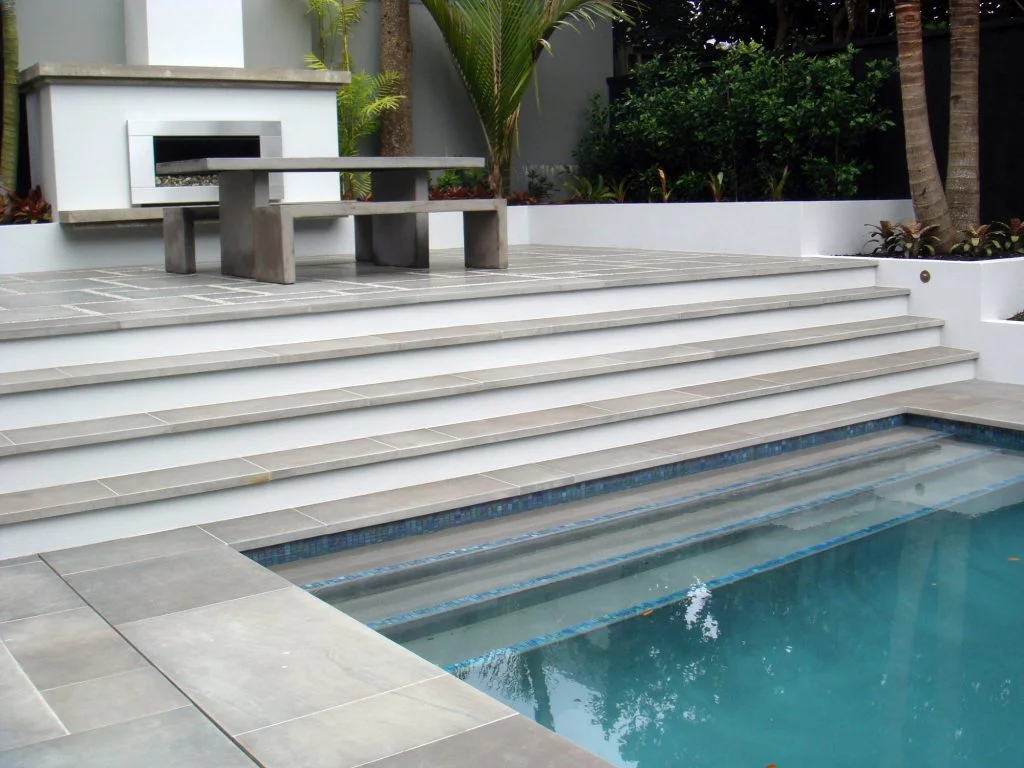 This contemporary pool and landscape setting showcases Silver Path stone in a refined matte finish across the entire outdoor space. Generous pavers define the pool deck and adjoining terraces, while coordinated coping and stair elements ensure a seamless visual transition. The gentle grey tones pair effortlessly with the water and surrounding greenery, creating a relaxed coastal atmosphere. Bespoke curved coping provides a clean, sculpted edge to the pool. The result is a resilient, cohesive environment with a timeless and harmonious character.