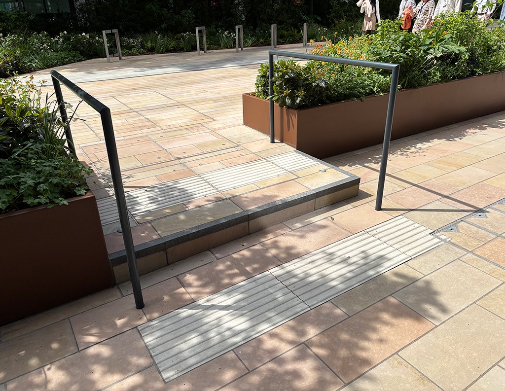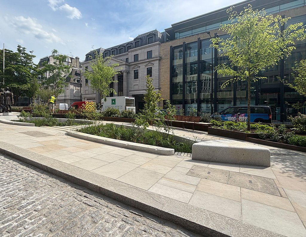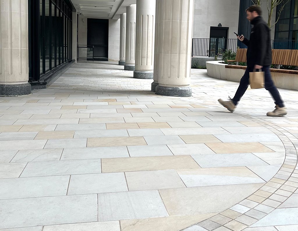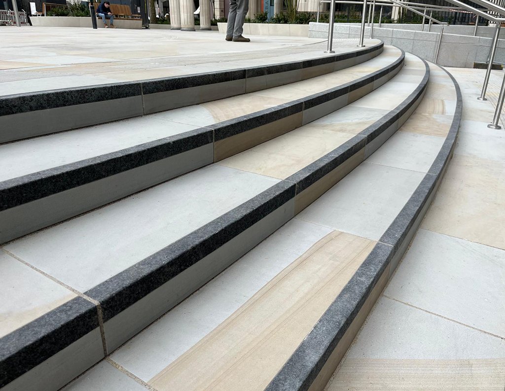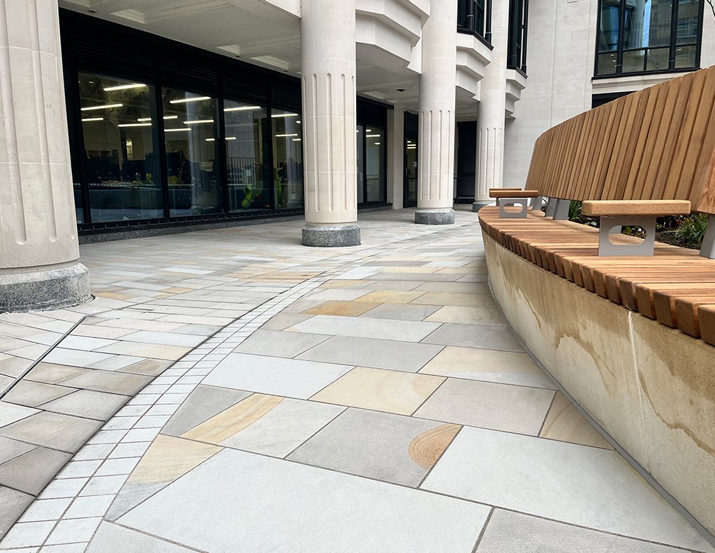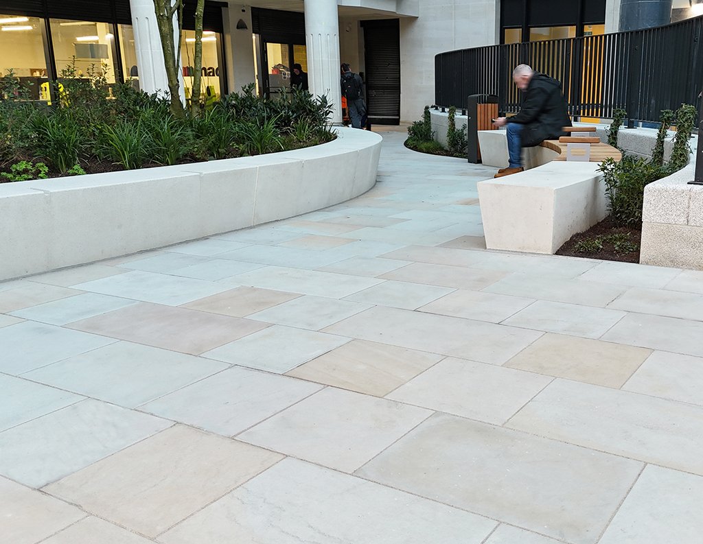 We used Two Tone stone with an oceana finish for the kerbs, paving, setts, steps, and tactile surfaces to create a refined outdoor space around a modern office building. The light, natural colours make the courtyard feel open, and the different stone formats help guide people through seating areas, walkways, and entrances. The finished space is organised and welcoming, supporting daily activity and fitting in well with the surrounding architecture.