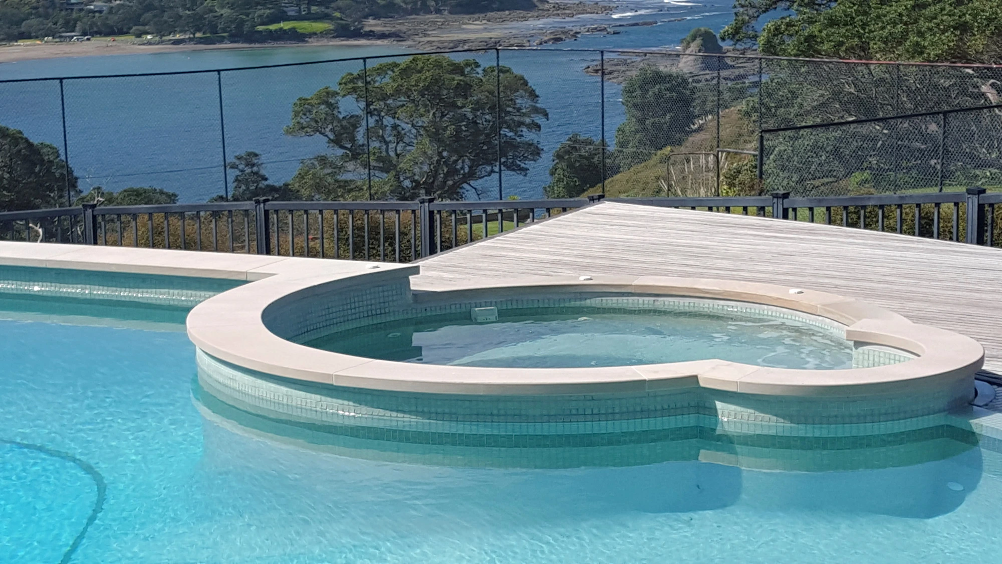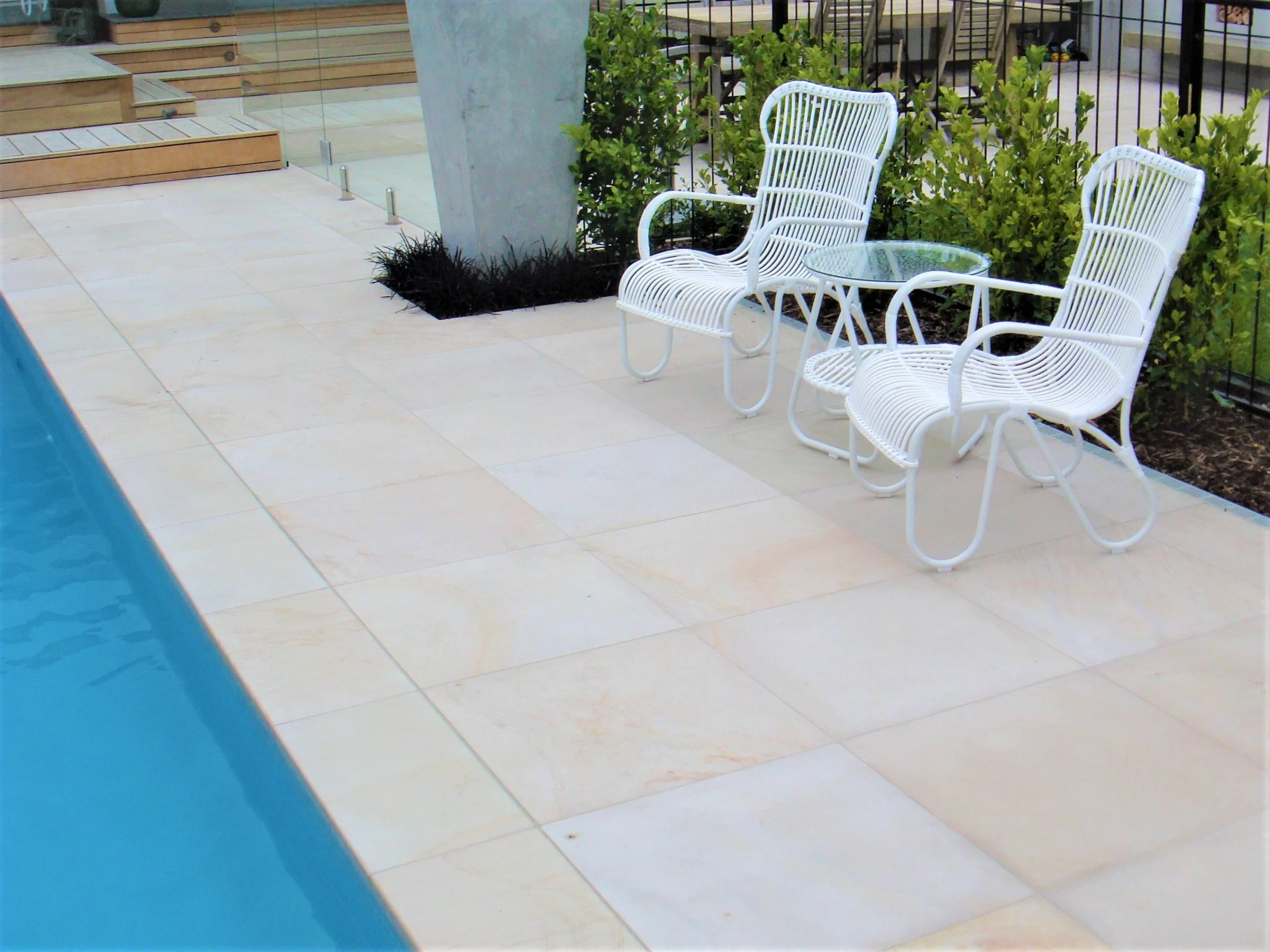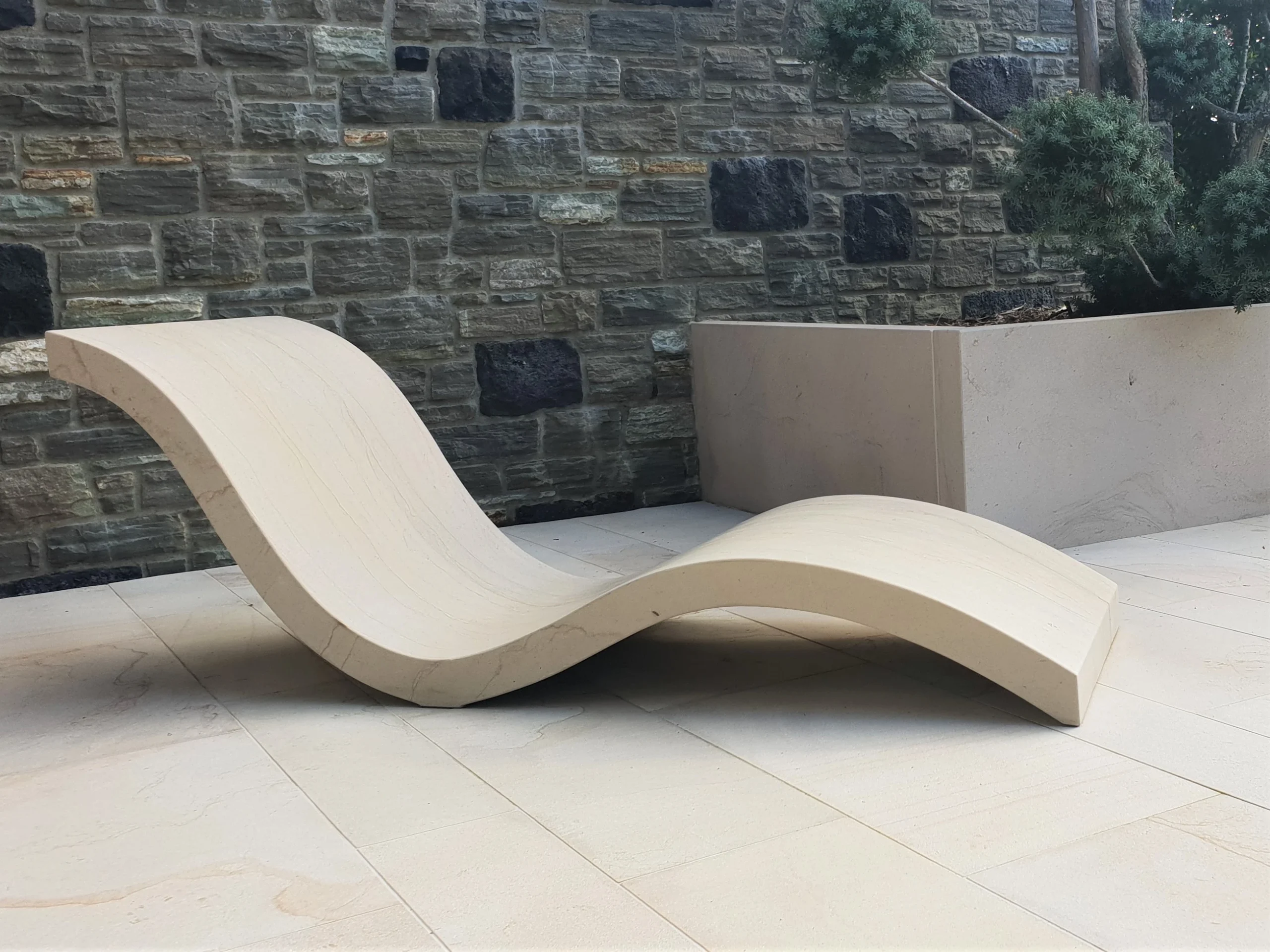 This contemporary pool, made from Arctic Mist, features a sawn, matte finish on the radial coping, pavers, and integrated stone furniture, bringing a refined, coastal calm to the high-altitude setting. The mechanism eliminates exposed hooks or risky components, while the durable stonework ensures long-term performance, creating a space that remains elegant and unobtrusive. Its smooth operation and seamless integration elevate everyday usability while maintaining its aesthetic appeal.